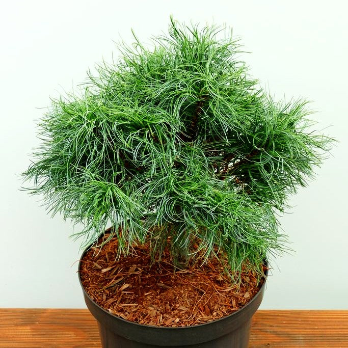 Die Zwerg-Seiden-Kiefer (Pinus strobus 'Squiggles') ist ein bezauberndes Nadelgehölz, das mit seinen charakteristisch gedrehten, blaugrünen Nadeln ein faszinierendes Erscheinungsbild bietet. Diese langsam wachsende Zwergform entwickelt einen dicht geschlossenen, breit ausladenden Wuchs und gehört zu den Zwerggehölzen bis 0,5 m – perfekt für den kleinen Garten. Das wintergrüne Gehölz bevorzugt sonnige bis absonnige Standorte mit frischen Böden. Dank ihrer kompakten Größe ist die Zwerg-Seiden-Kiefer auch hervorragend für Grabstätten geeignet und setzt dort ganzjährig elegante Akzente.
